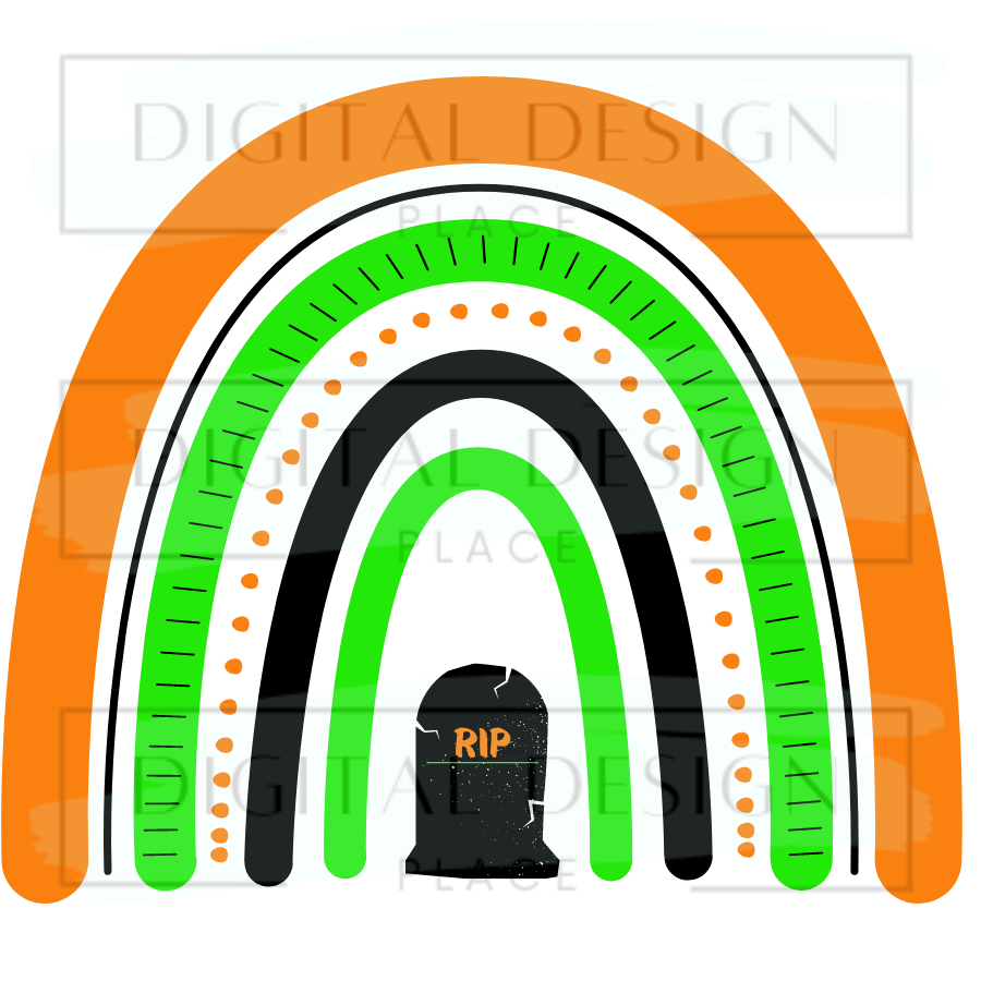 Boho Halloween Rainbow. Orange, Green and Black Rainbow, Black Tombstone, Orange and Green Accents