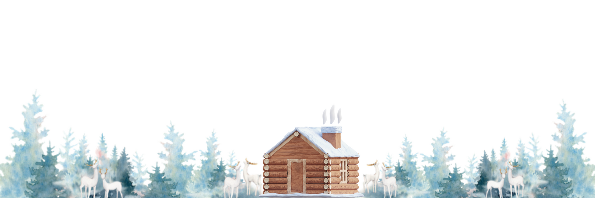 Watercolor Winter Scene. Blues, Greens, Whites. Cabin, Deer